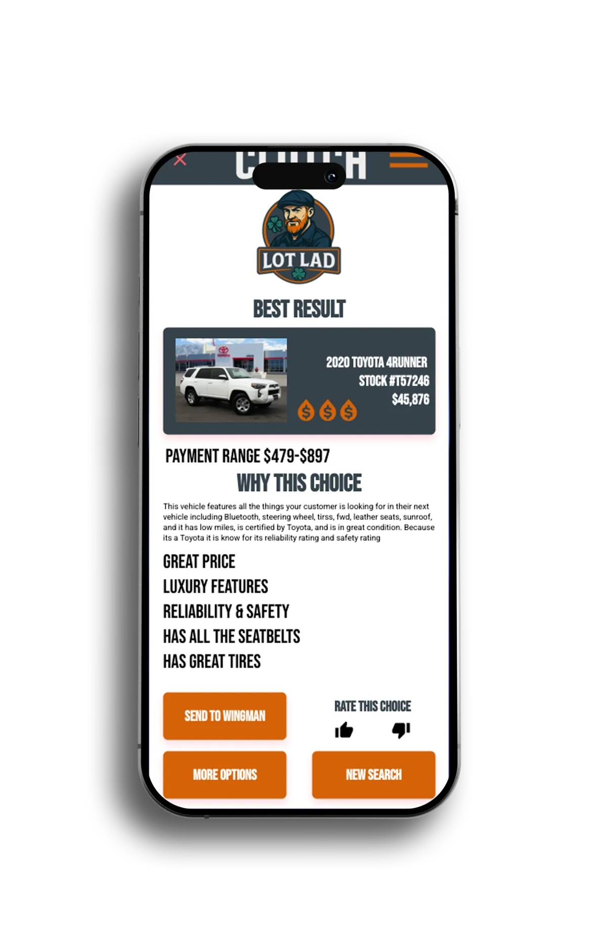 Lot Lad turns every sales rep into a fast, confident matchmaker — pairing customers with the right car instantly, without wasting time or losing deals.