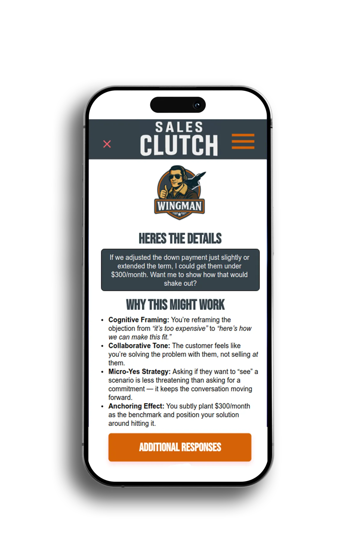 When a rep gets hit with a tough objection during a deal, Wingman is there. Reps can quickly speak or type the objection into the app — and Wingman responds instantly with multiple tailored rebuttals calibrated to tone and pressure.