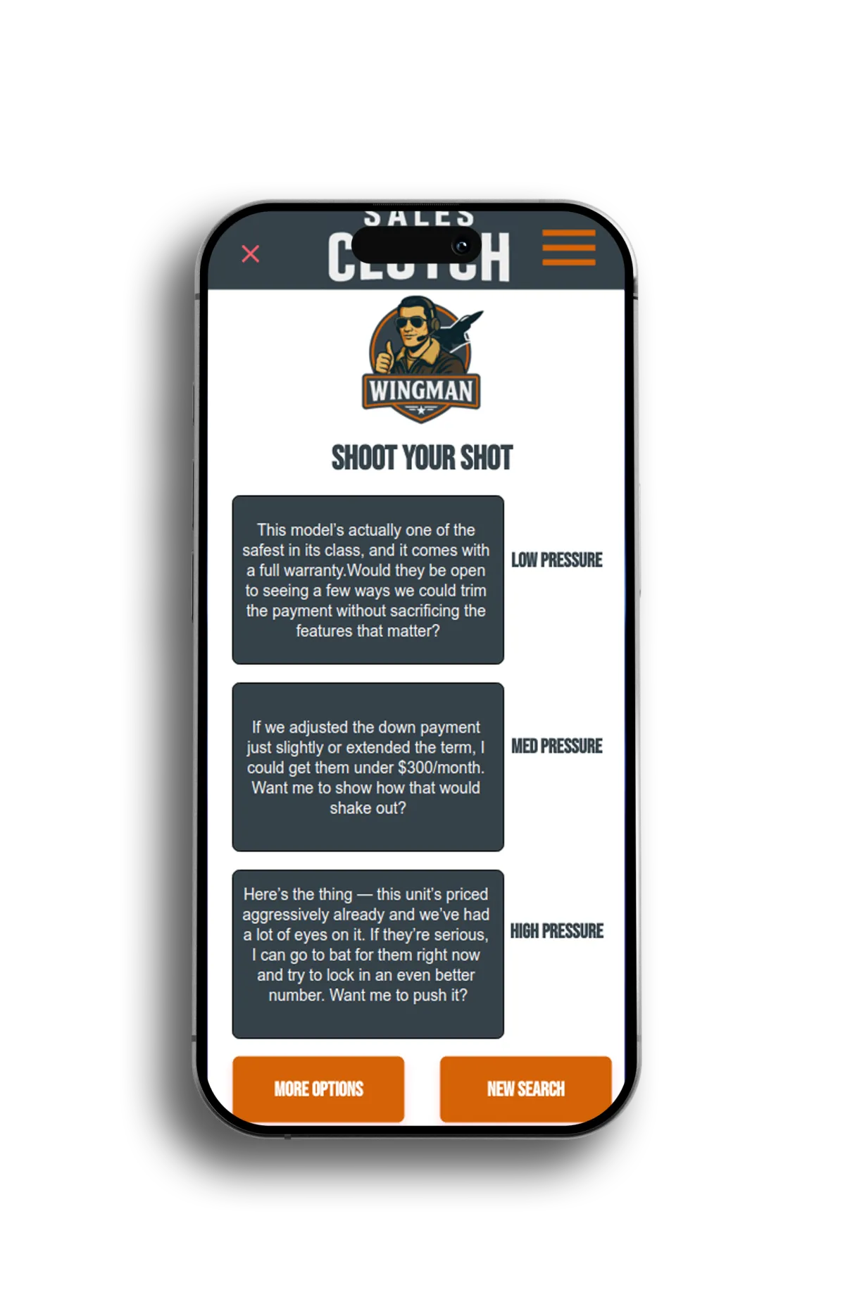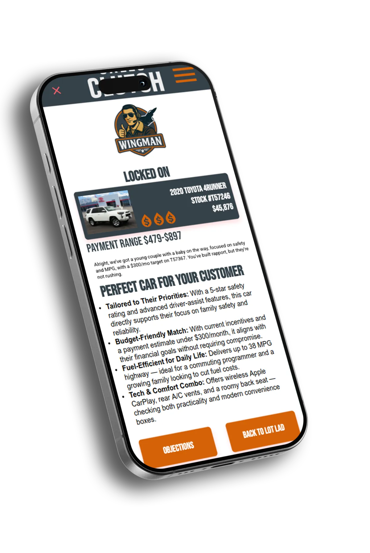 Once a rep has selected a vehicle — whether through Lot Lad or their own process — Wingman provides tailored guidance on how to present it in a way that resonates with that specific customer.